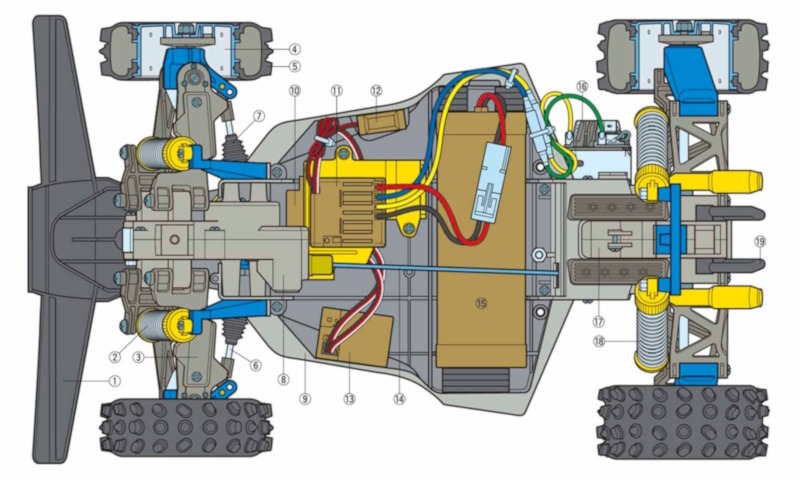 Rack and pinion steering (the only of its kind on a Tamiya model) gives excellent driving feel.