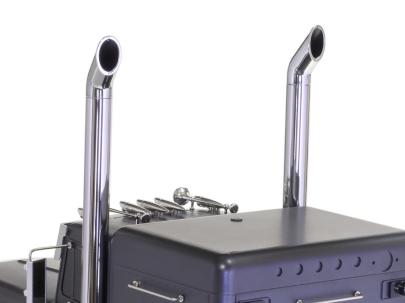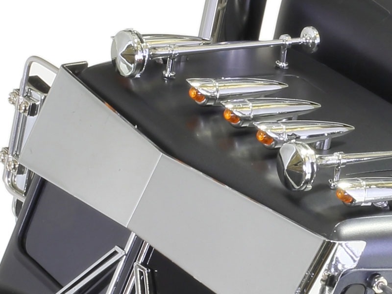 The model’s ladder frame chassis features aluminum side channels with resin cross members and is equipped with a highly realistic suspension utilizing metal leaf springs and friction dampers. A front-mounted motor and 3-speed transmission power the two rear wheel axles, which are fitted with built-in differentials to enable smooth cornering. A 4-channel R/C system and multi-function unit allow you to drive the vehicle and experience realistic lights, sounds and vibrations. (Both sold separately)