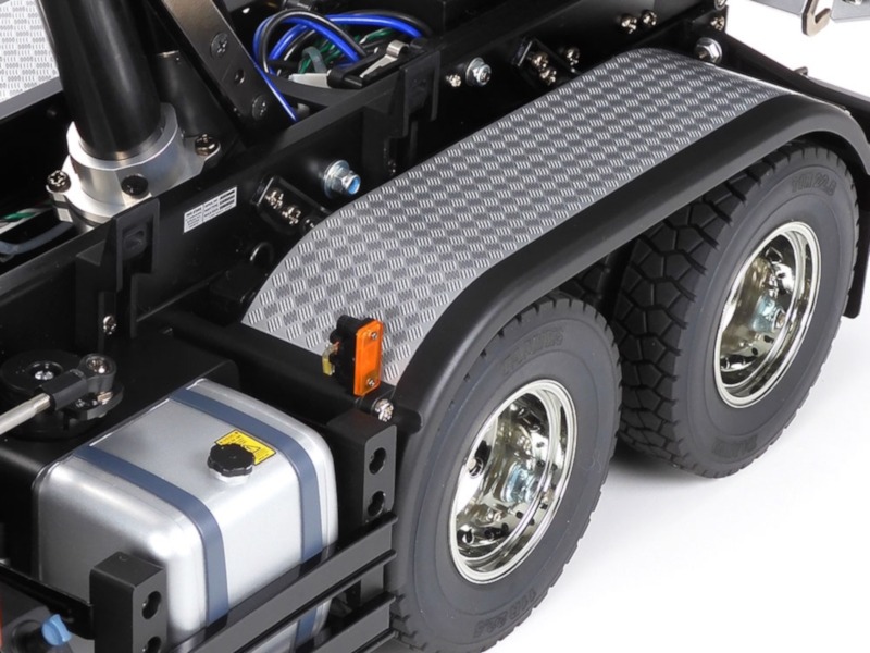 • The Tamiya 4-axle chassis has a tough ladder frame with aluminum side channels and plastic cross members.